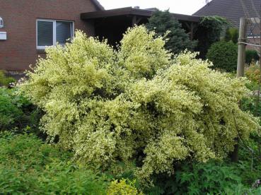 Zahlreiche hellgelbe Blüten schmücken diesen kleinen Strauch mit etwas bogig überhängenden Triebe im Mai.