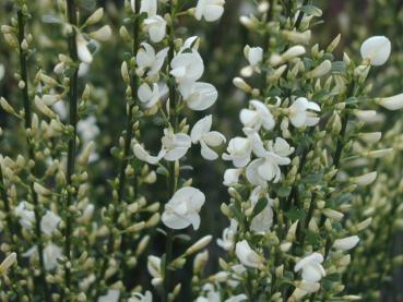 Der locker wachsende Edel-Ginster White Lion blüht im Mai/Juni mit einer reichen, reinweißen Blüte.