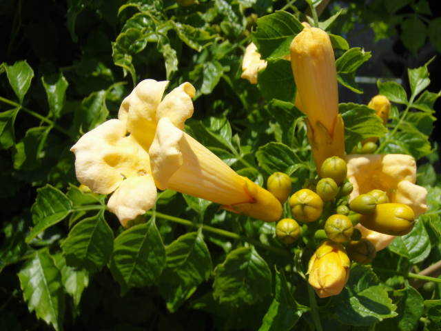 die gelbblühende Trompetenblume Flava kann problemlos 3 Meter hoch klettern, bei sehr guten Bedingungen auch bis zu 6 m.