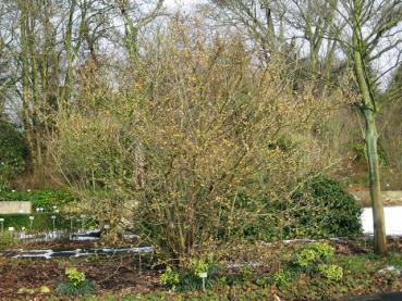 Ich wohne im Frankenwald, 850 m über NN. Hamamellis mollis ist bei uns nicht winterhart.