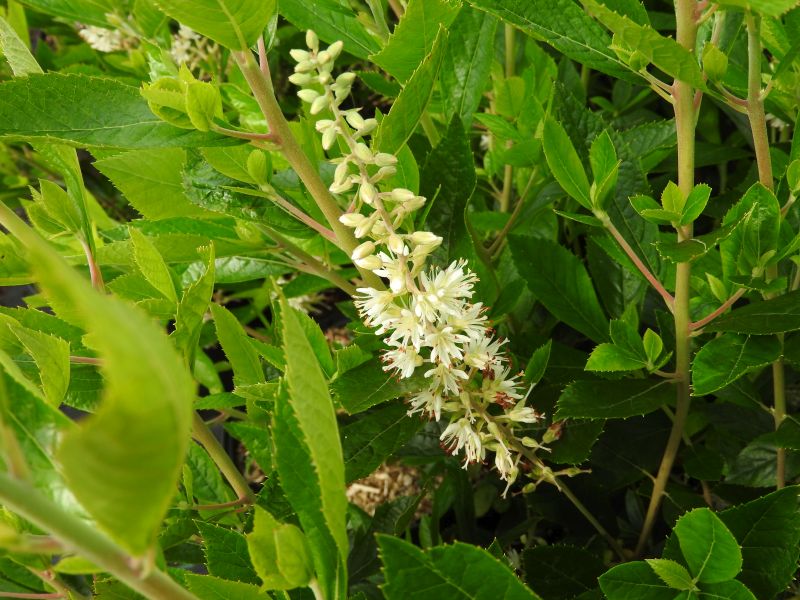 Der Silberkerzenstrauch, auch Erlenblättrige Zimterle oder Scheineller genannt, stammt ursprünglich aus Nordamerika. Bei Clethra alnifolia Hummingbird handelt es sich um eine kompakte, eher langsam wachsende Sorte der Zimterle, die nur bis zu ca. 1,0-1,5 m hoch und breit wird. Dieser pflegeleichte, aufrecht wachsende Zierstrauch hat eine schöne, mittelgrüne Belaubung. Ab Juli bis September schmückt sich Clethra alnifolia Hummingbird mit traubig angeordneten, angenehm vanilleartig duftenden, weißen Blüten, die von Bienen, Schmetterlingen und anderen Insekten gerne angeflogen werden. Auch im Herbst ist der Silberkerzenstrauch Hummingbird noch sehr dekorativ, wenn seine am Rand gezähnten Laubblätter eine intensive gelbe bis rote Färbung annehmen.