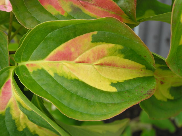 Der wunderschöne Gold-Blumenhartriegel, Cornus kousa Goldstar, ist leider anfällig für Blattfleckenkrankheiten, die bei ungünstiger Witterung auftreten. Diese sind unschön, müssen aber nun wohl geduldet werden. Vor Ausbruch der Krankheit kann mit Signum gespritzt werden, bereits vorhandener Befall lässt sich aber leider nicht beseitigen.