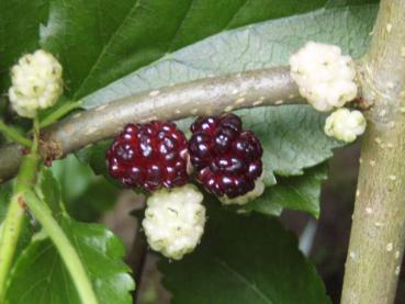 es gehört zu den Eigenschaften des Morus alba, dass seine Beeren teils weiß, teils schwarzrot sind.