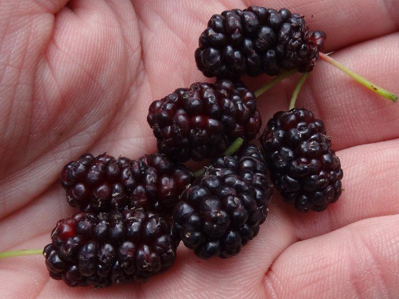 wir waren vor 2 Wochen an der Mosel und unter anderem im Sortengarten in Zeltingen-Rachtig. Dort gibt es eine Züchtung Morus nigra, die "knubbelige", sehr saftige Früchte (unsere Hände waren komplett rot "versifft") hervorbringt (die einzelnen Segmente der Frucht sind grösser als bei den länglichen Früchten).