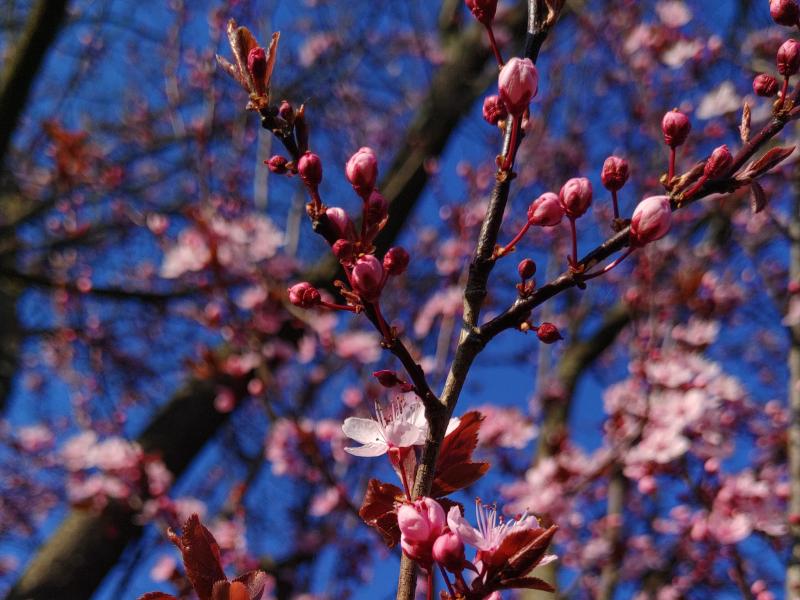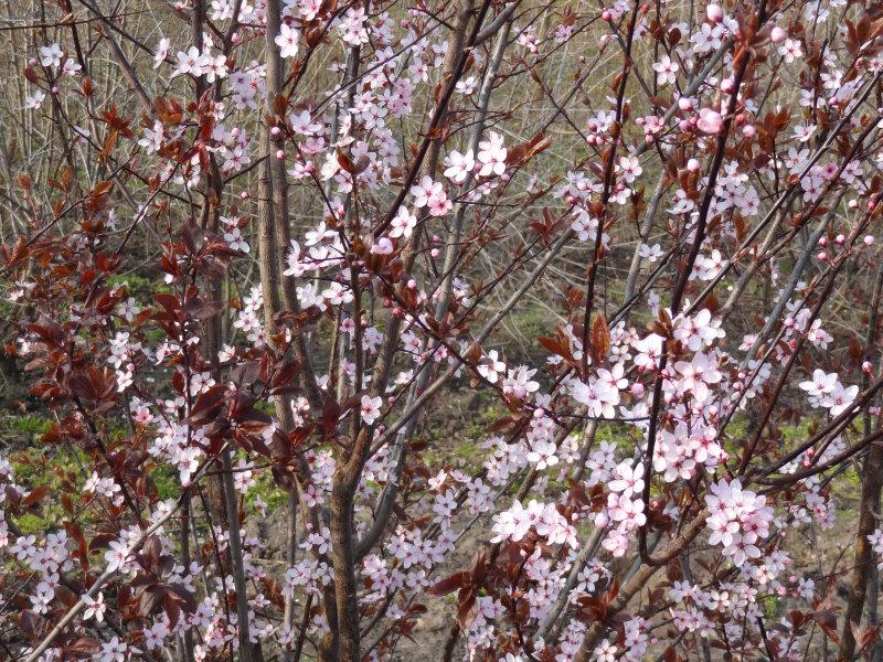 Die Blutpflaume, Prunus cerasifera Nigra, ist die "langweiligste" Variante. Im Frühjahr verwandelt sie sich in ein rosa Blütenmeer, danach kennzeichnen sie nur noch die dunkelroten Blätter.