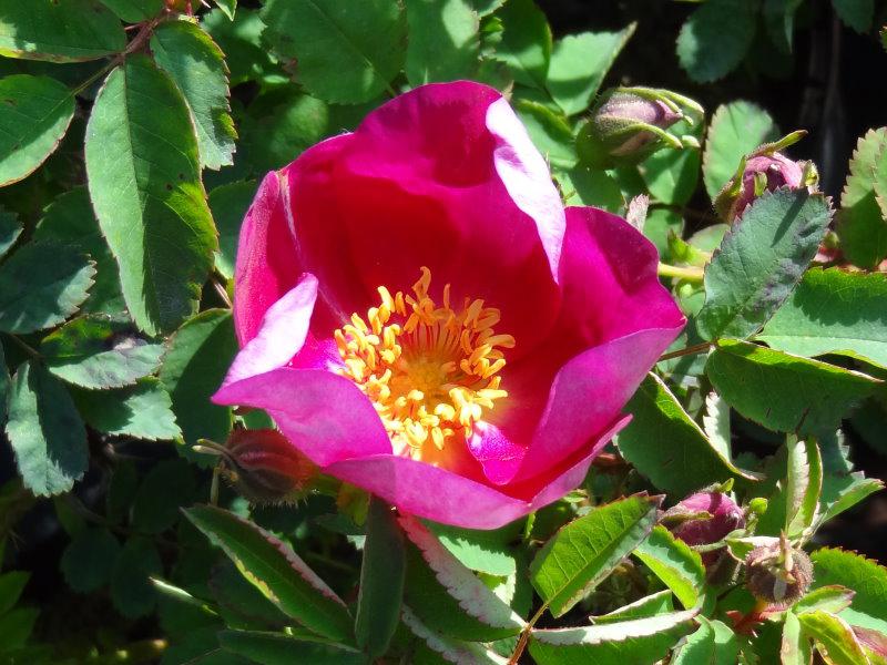 Rosa pimpinellifolia und die Rose Red Nelly kommen beide mit dem beschriebenen Boden zurecht. Allerdings bildet Rosa pimpinellifolia Ausläufer, was in einem Schrebergarten eventuell problematisch sein könnte. Red Nelly ist veredelt und bildet daher keine Ausläufer.