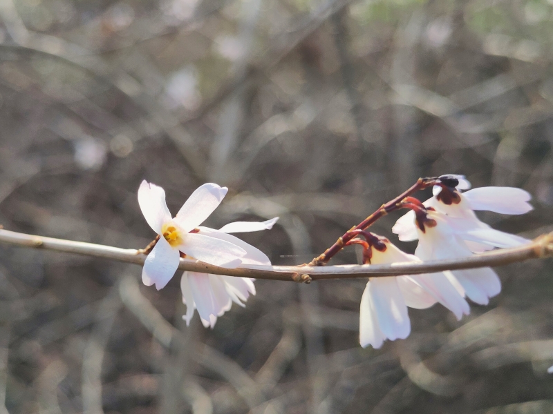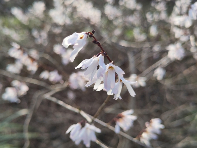 Vinterbusken är hittills ganska sällsynt i våra trädgårdar och måste betraktas som en raritet. Den har sitt naturliga ursprung i Sydkorea. Liksom den gulblommiga forsythian som vi känner till tillhör den syrenväxterna. Blommorna på de båda växterna är mycket lika varandra. Redan innan löven växer upp kommer de vita, lätt rosa blommorna i början av mars, och de ger en delikat doft av mandel. Från dem växer vingade nötter som är 2-3 cm stora på sommaren. De fyrkantiga skotten av Abeliophyllum distichum är ganska sirliga och överhängande när de blir högre. Den här busken blir upp till 1,5 meter hög. Dess blad är mindre än forsythians och påminner om abelias blad, vilket återspeglas i det botaniska namnet. Tack vare sina många tidiga blommor är vinterbusken en värdefull nektarkälla för humlor och bin.